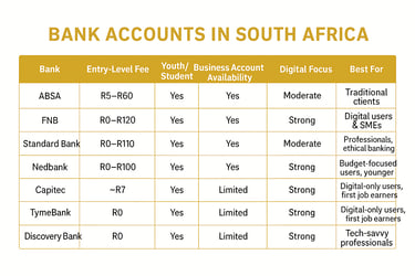 This guide breaks down the major banks in South Africa, comparing personal, youth/student and business account options. By understanding each bank’s strengths and ideal user, you’ll be able to choose the account that genuinely aligns with your financial needs.